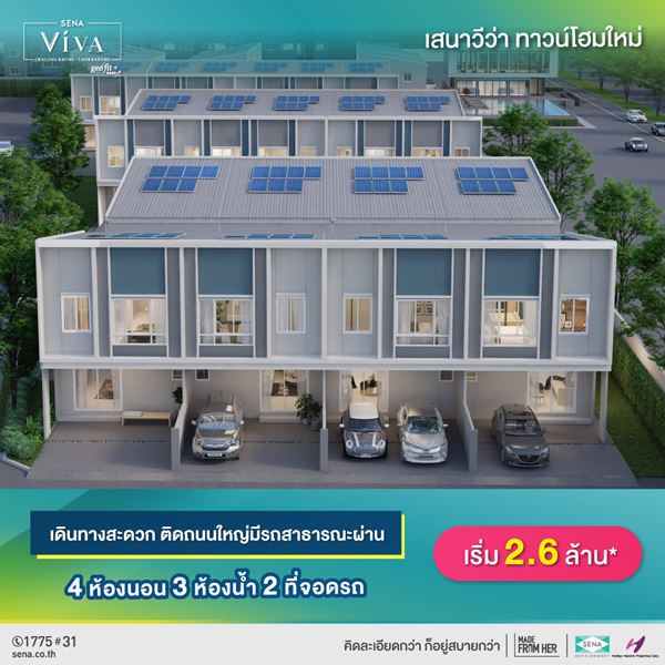 ขายทาวน์โฮมใหม่ พร้อมอยู่ เสนา วีว่า ฉลองกรุง-ลาดกระบัง ติดถนนใหญ่ พร้อมติดตั้งโซล่าเซลล์ ใช้ไฟฟรี 25 ปี